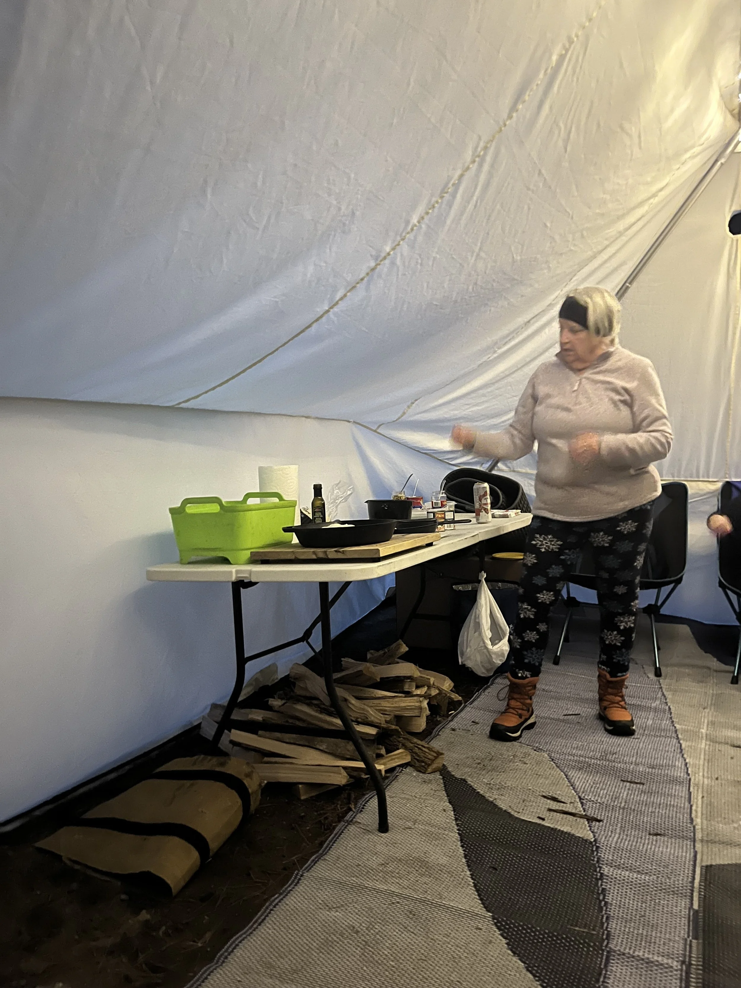 As the Warming Partner for a year, your brand becomes synonymous with the literal centre of Freezing Woman. It’s cold outside, and this spacious Mega Crew canvas hot tent, with a large wood stove is a refuge. It is our primary warming commons, and "town square", where participants visit continually to meet up, warm up, and recharge together.